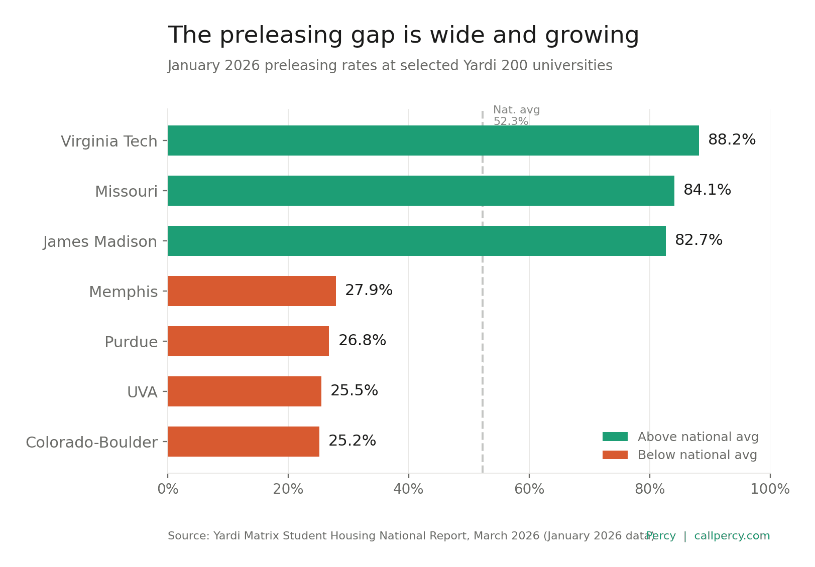 The national preleasing figure masks a sharp split. As of January, Virginia Tech led surveyed markets at 88.2% preleased. The University of Missouri sat at 84.1%. James Madison at 82.7%. These communities made staffing, pricing, and marketing decisions months ago, and the results are showing.