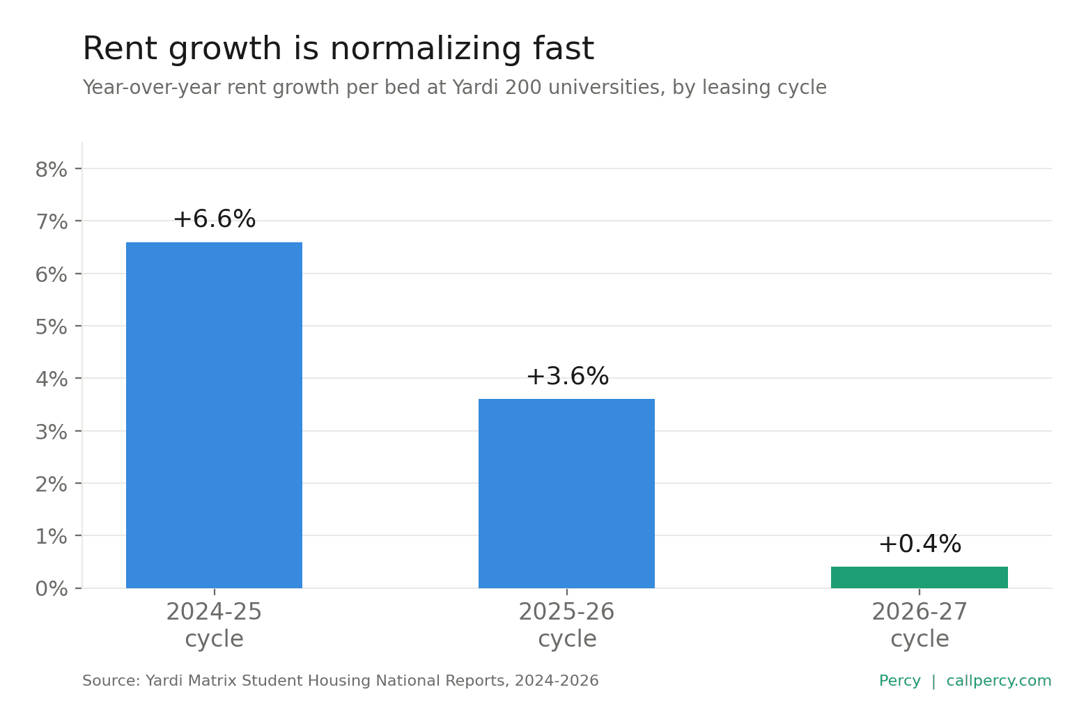 But the leasing environment underneath those numbers has shifted, and the shift has a direct implication for how operators staff their on-site teams. After two years of post-pandemic rent surges (6.6% growth two years ago, 3.6% last year), the cycle is normalizing. Preleasing for the 2026-2027 cycle reached an estimated 58.6% in February, according to the Yardi Matrix March 2026 Student Housing National Report. Average rent per bed reached $925, up just 0.4% year over year. Roughly 28,000 to 30,000 new beds are expected to deliver for Fall 2026 across 37 campuses.